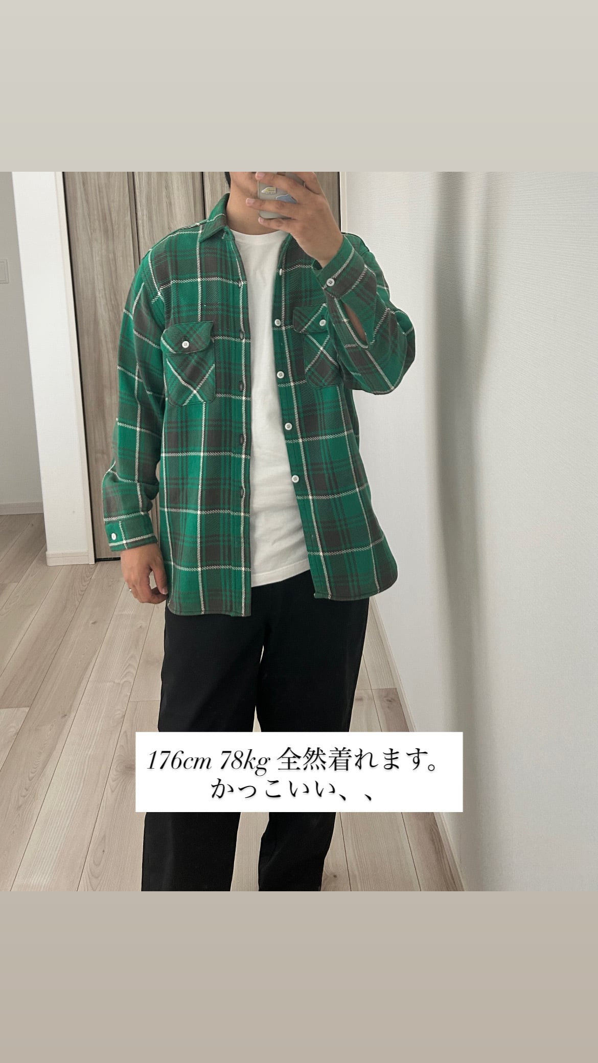前丈が長い着丈で、白の皿ボタンもアクセントになってます。